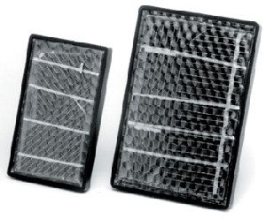 Solar cells encapsulated in polycarbonate case with a honeycomb of lenses on the surface to intensify and focus the power of the light onto the solar crystals below. The output current is 400mA. These cells are able to power solar motors when set below a 100W bulb. At the rear of the cells are metal fixing screws with hexagonal nuts for easy connection.