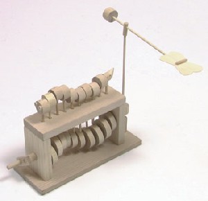 10 cams produce an undulating movement in the caterpillar segments. The friction bearing turns a shaft which makes a butterfly circle overhead.